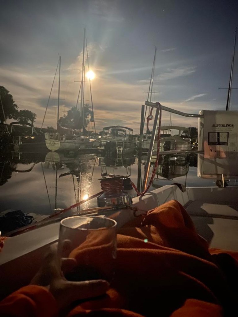 We survived our first thunderstorm-having no idea what safe protocol was for a sailboat with a near 40 foot mast….the only one in the entire marina, and woke up to another beautiful day to motor further down river.