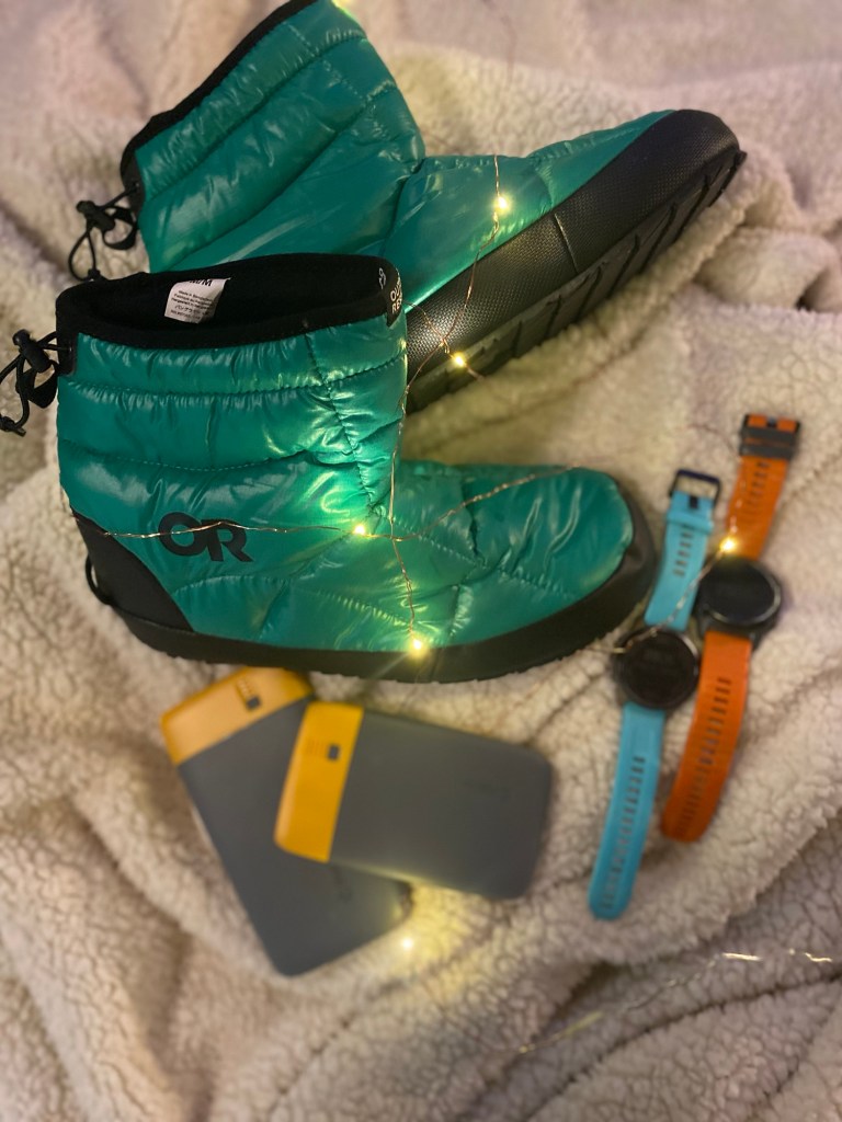 - Down Booties. These are what I call a luxury item. But a nice down (or insulated of some sort) bootie can really elevate any ski, camper, winter or fall trip in general. I really like a pair with a non-fabric bottom that doesn’t get saturated like these Tunda Trax from Outdoor Research.